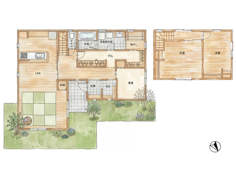 水回りは洗面台→物干し→収納までをスムーズにつなぐ動線計画とし、毎日の家事がラクになる工夫を実現。