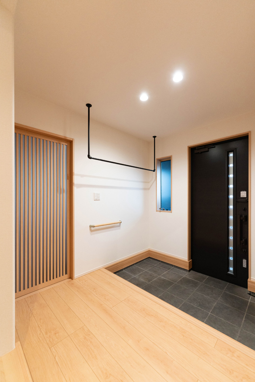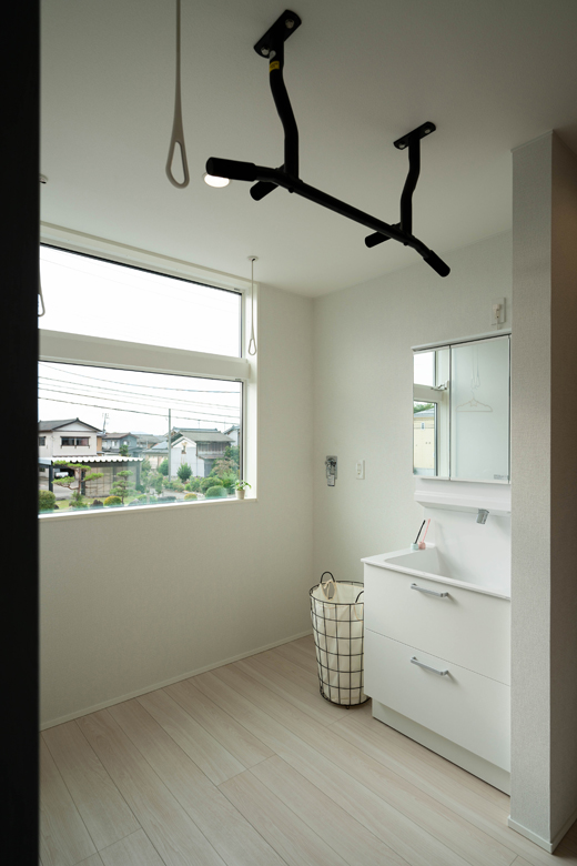 また、アクセントとしてアイアン素材の黒いバーを使いました。玄関のコート掛けや2階ランドリーに設置した筋トレ用のバーも、空間の引き締め効果を担っています。