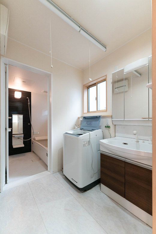 洗面・ランドリーとお風呂場の間に脱衣室を設け、家事と入浴の動線を分離。水回りの混雑が解消された。