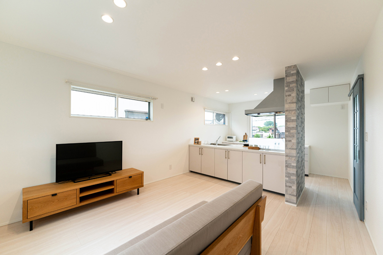 居室の2部屋を1部屋にし、LDKにまとめた。白で統一したコーディネートで明るさもプラス