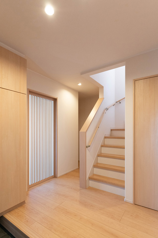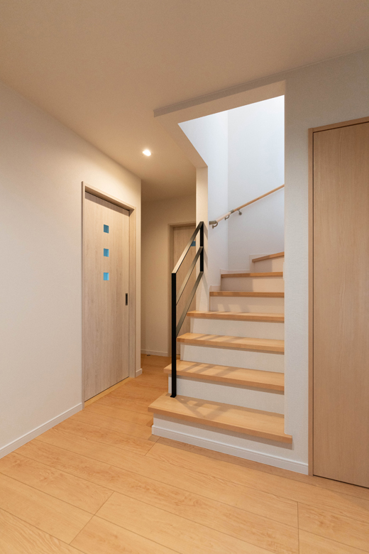 玄関は圧迫感を減らしたいというご要望もあったので、ホール階段の手すりを鉄骨にし、抜け感を出しました。
