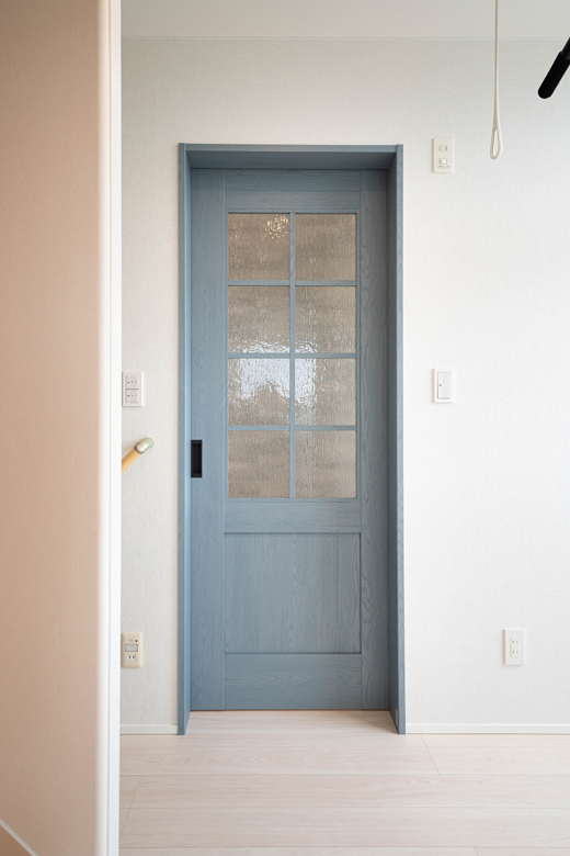 2階リビング入り口にパステルカラーのシックなデザインの建具を取り入れた
