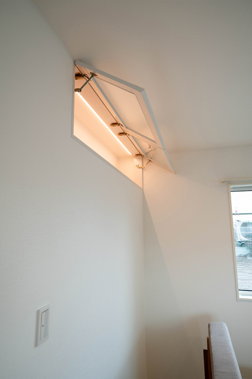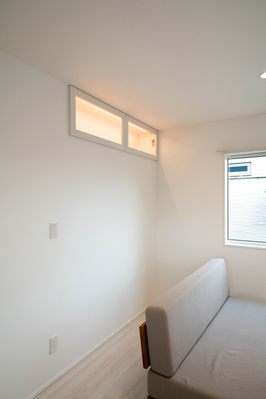 また、プラモデルがご趣味とのことで、リビングの一角に飾り棚を設け、間接照明でディスプレイを演出できるようにしました。ご自身の世界観を表現できるスペースとして、とても気に入っていただけたと思います。