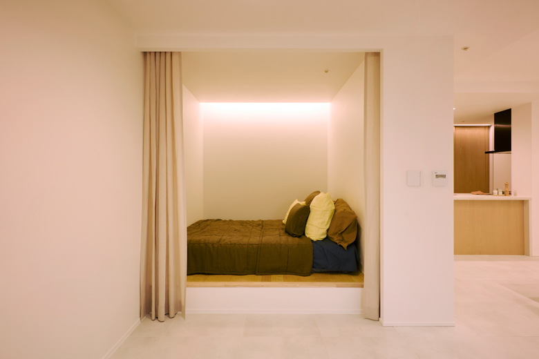 LDKとつなげた寝室。カーテンでゆるやかに仕切ることで、籠もれるリラックス空間を確保。
