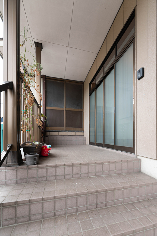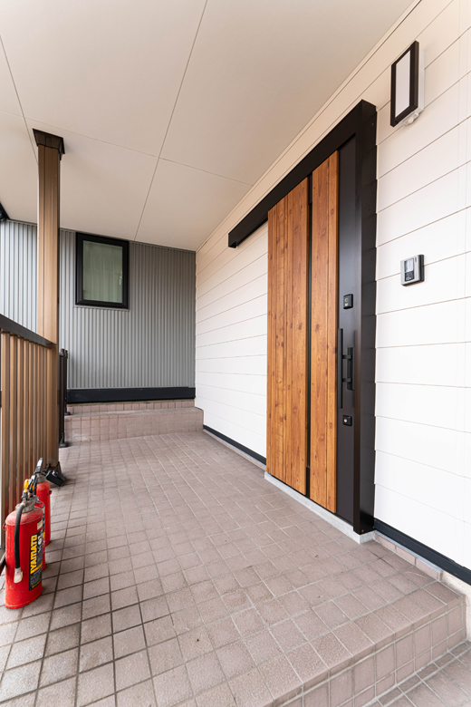 リノベーション後の玄関ポーチ。工場の出入り口だったところは塞ぎ、外からの出入りは玄関ドアからのみとなった。