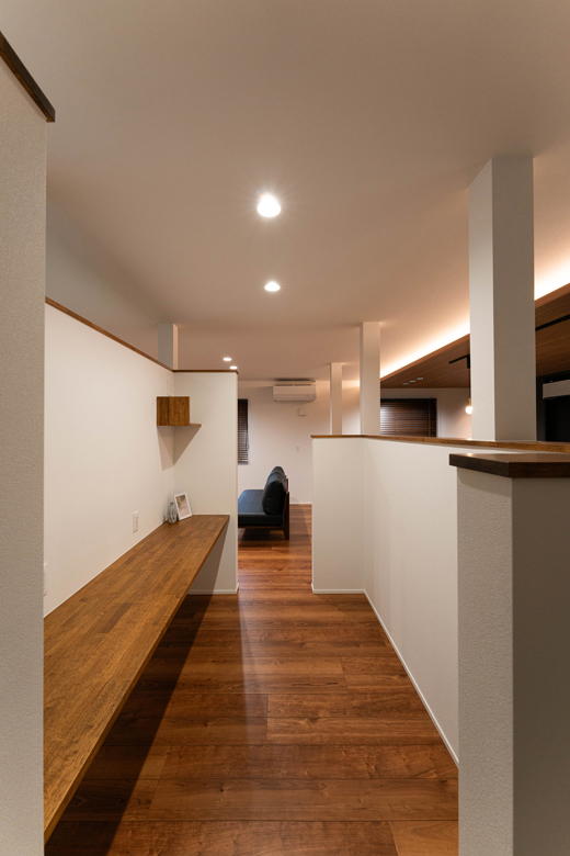 半個室のような子どもたちのスタディスペース。キッチン側をあえて低くし、家事をしながら子どもたちの様子を見守れるように工夫している。
