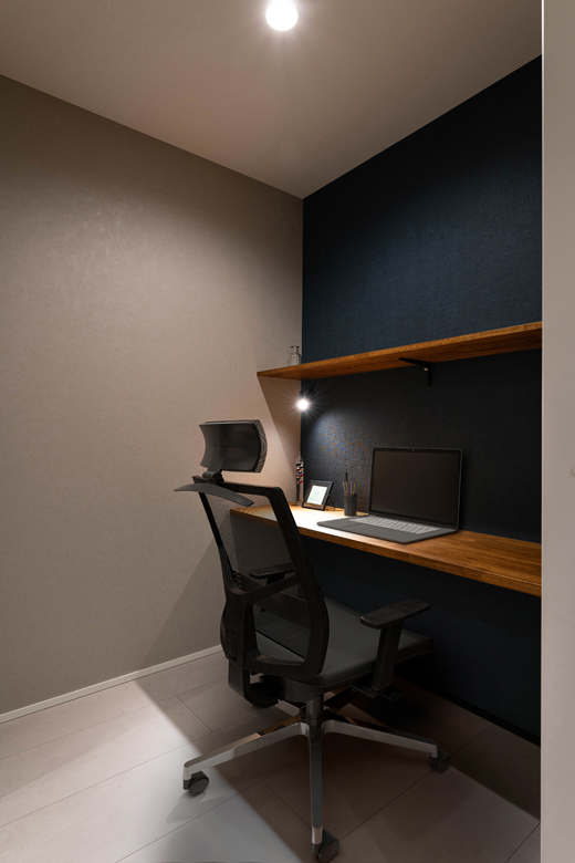 (営業・設計)はい、できるだけ静かに集中できるように、LDKのバックスペース側の角に書斎を配置しました。とはいえ、キッチンからも近いので、飲み物を取りに行ったりするのにも便利な位置です。ほどよくこもれて、ほどよく生活とつながっている場所ですね。