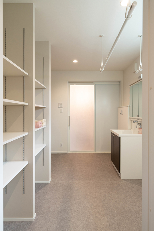 洗濯物が乾いたらそのままウォークインクローゼットへ掛けられる家事楽な配置。寝室ともつながっており、廊下を含めた回遊動線となっている。