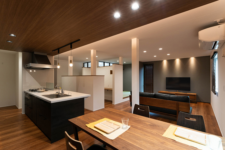 ダークトーンで統一したLDK。子どもたちが駆け回れるほど広々とした空間に生まれ変わった。