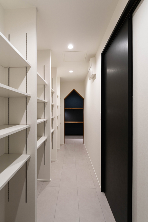 キッチン裏の大容量パントリー。書斎とつながるバックヤードに遊び心ある下り壁を採用。