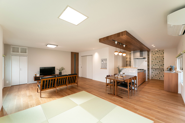 30畳の広々LDK。柱なしの大空間を実現できたのも、重量鉄骨造だからこそ。