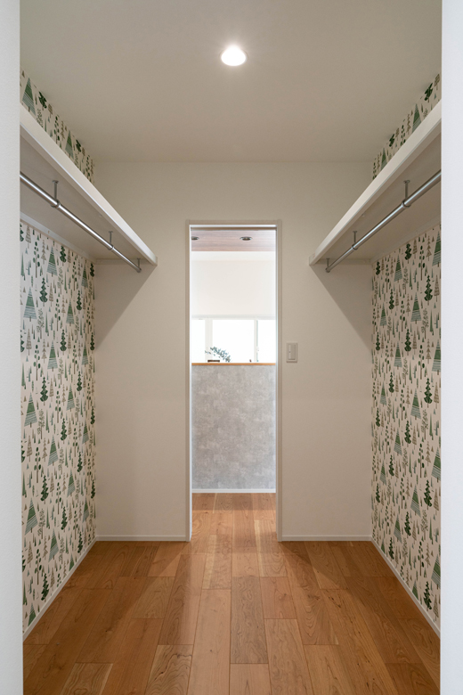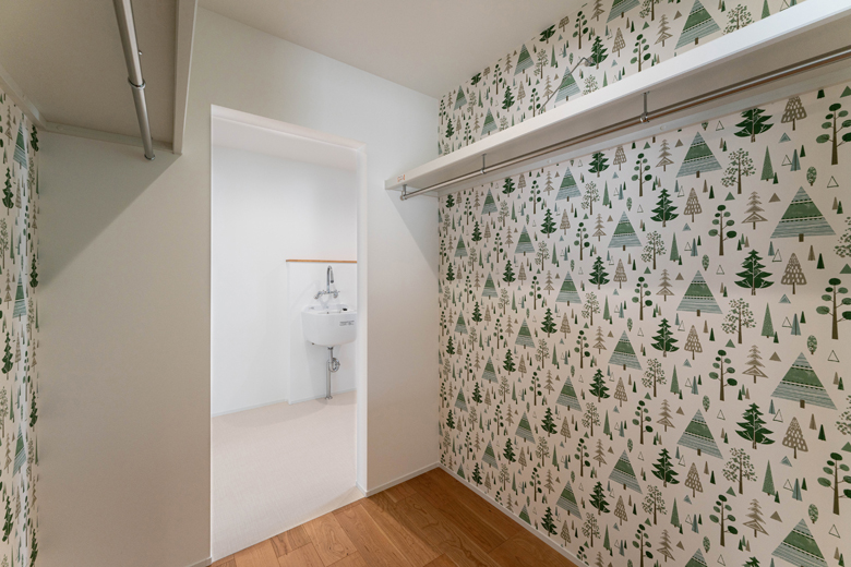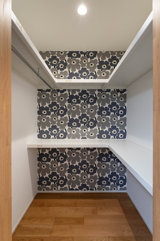 (コーディネーター)はい。北欧らしい森林柄のクロスは、奥様が洗面台に使いたいとご希望されたのがきっかけ。せっかくだからパントリーやファミリークロークにも提案させていただきました。寝室に隣接するウォークインクローゼットにはマリメッコ柄を使い、遊び心のある空間に仕上げています。