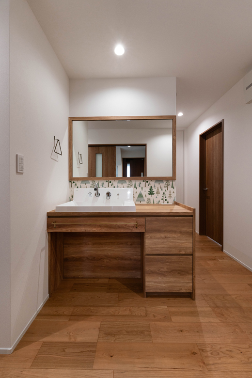 洗面台に使用した森林柄クロスは奥様のご希望。