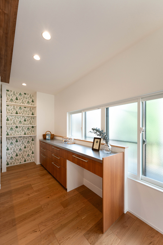 (営業・設計)キッチンのすぐ近くにファミリークロークを配置したことで、洗濯、収納、料理の動線がスムーズにつながるようにしました。キッチン前からランドリールーム、リビングへと一周できる「回遊動線」にしたことで、家事がとても楽になったと喜ばれています。