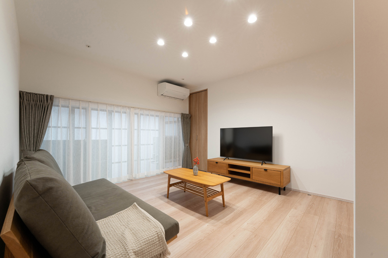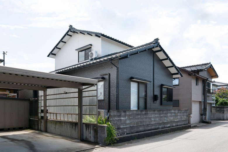 (営業・設計)木造2階建てのお住まいで、お父様から譲り受けたご実家になります。5年ほど前に外壁を一度上張りされていたので、今回はその一部と床を残すかたちで減築を含むリノベーションを行いました。壁と天井には断熱材を新たに入れ、窓の入れ替えもしています。床材については、既存のフローリングの上に新たに重ね張りをしました。