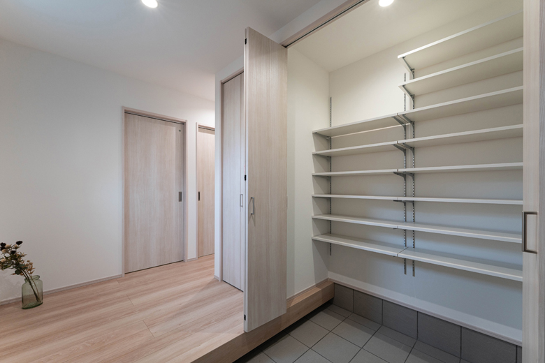 (営業・設計)玄関まわりに収納が少なかったので、新たにコートなども掛けられる収納スペースを設けました。昔ながらのつくりで全体的に収納が不足していたため、各所に隠せる収納をしっかりと配置しています。