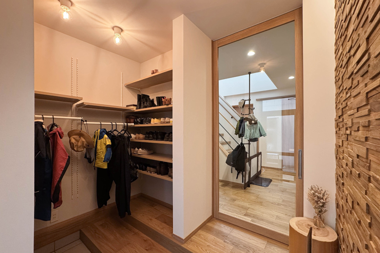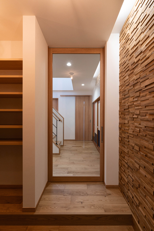 (営業:五十嵐)玄関が一番悩まれて、何度か変更されたところですよね。シューズクロークをどうするか、玄関とホールの間に扉をつけるか、など。空調を考えると扉をつけたいけれど、オープンな形にしたい、というご希望もあったので、ガラス戸を提案させていただきました。