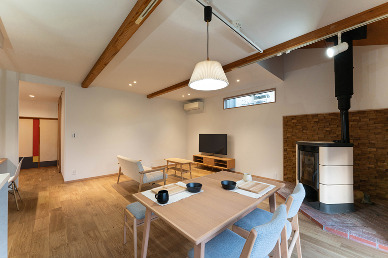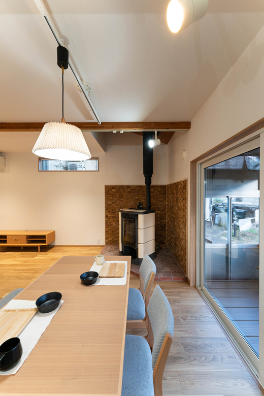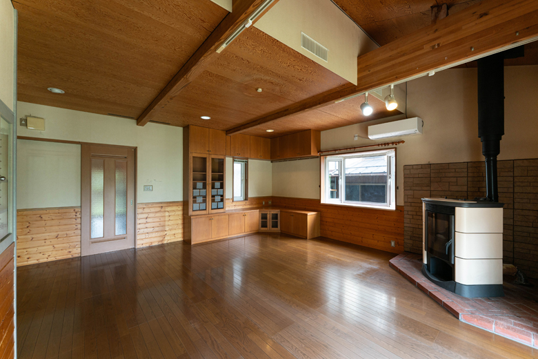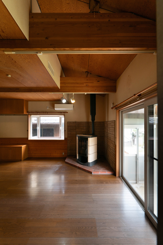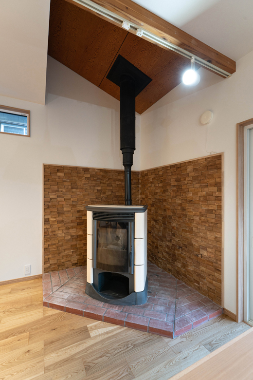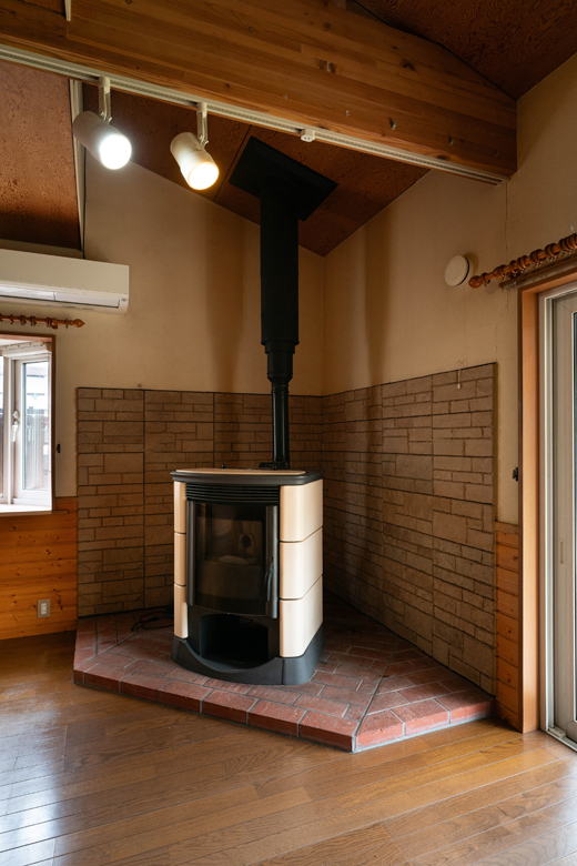 (営業:五十嵐)前は防火必須の薪ストーブだったため、窯業(レンガ)が使われていました。今回ペレットにしたので制限が緩和され、木の壁でも施工可能になったんです。ただし木は乾燥や収縮が起こりやすいので、ご理解いただいた上で施工させていただきました。