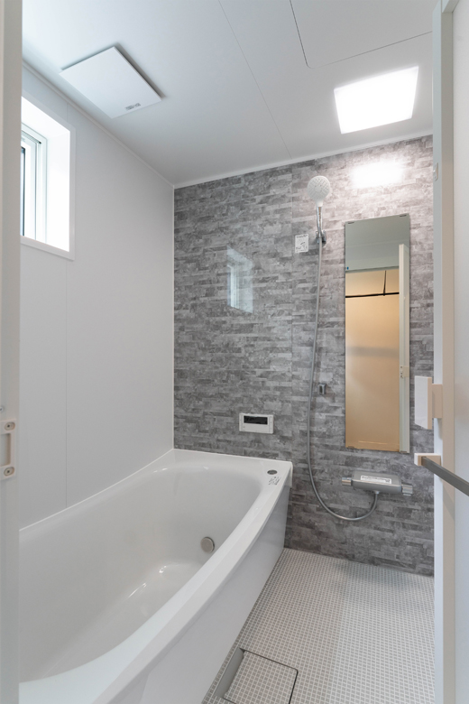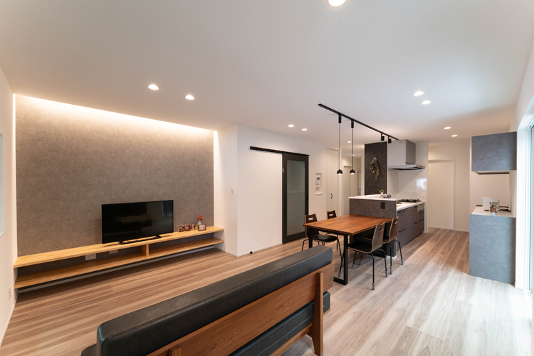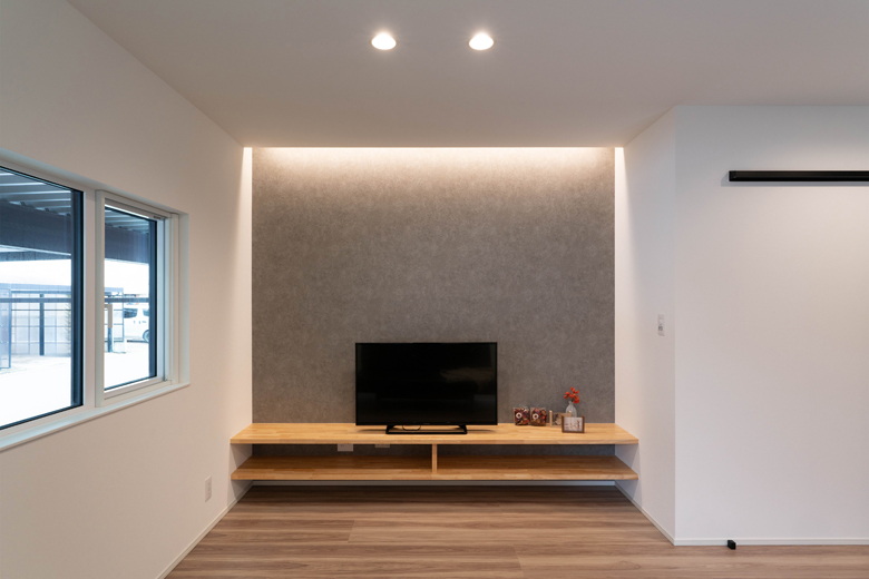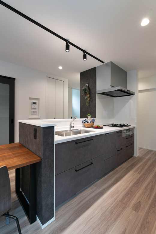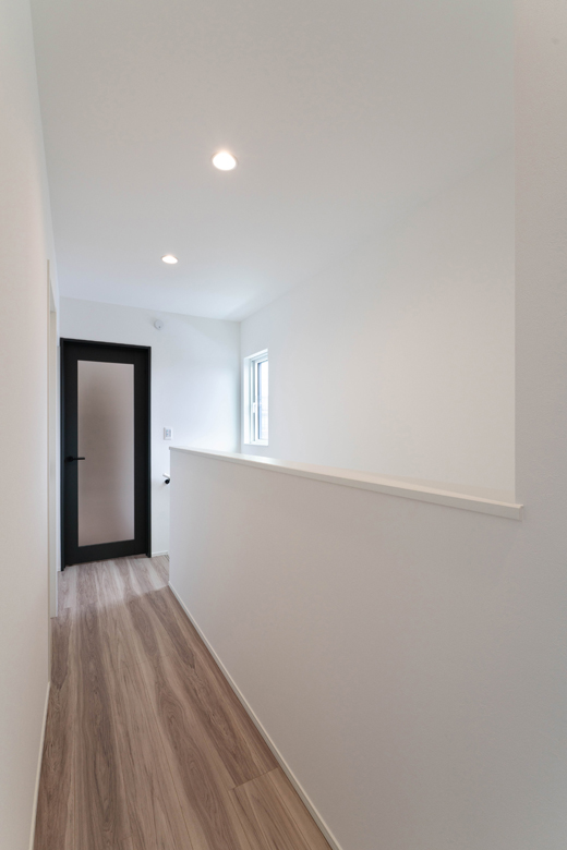 白を基調とした中にグレーを取り入れたシンプルモダン。黒のライン空間をで引き締めている。