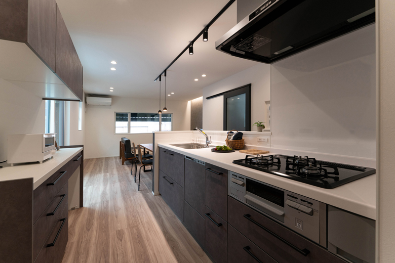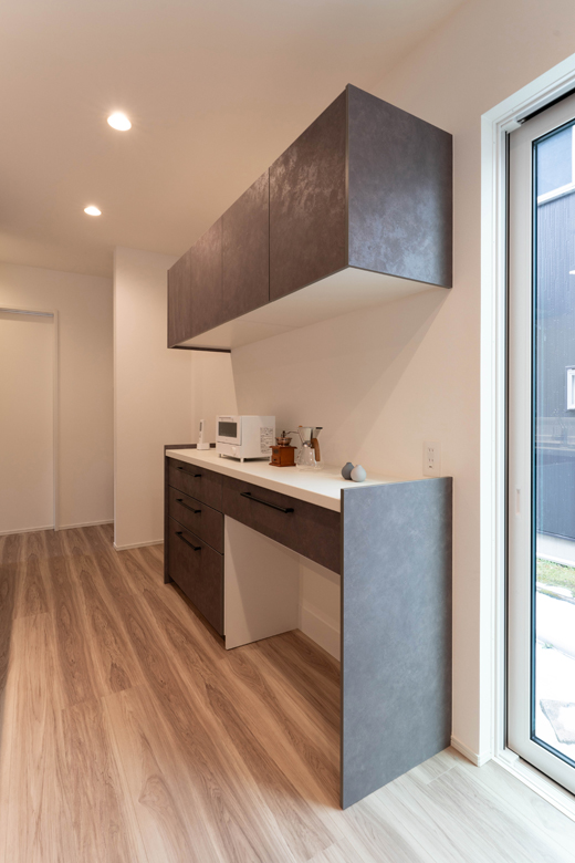 また、キッチンとカップボードはTOTOのアモスグレーという新色を採用。足で水の出し止めができるフットスイッチや、フロントオープン型の食洗機など、機能性にもこだわっています。