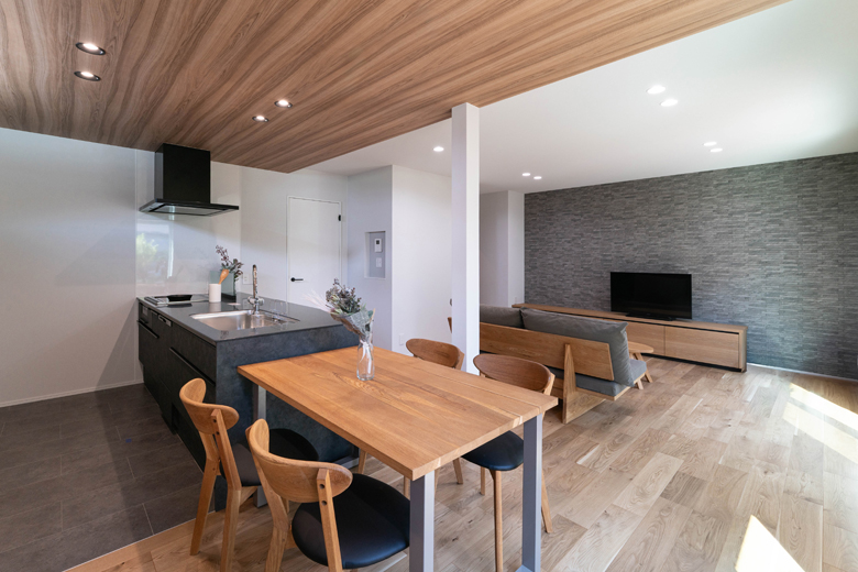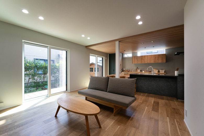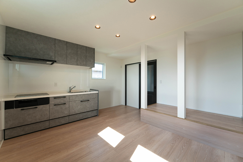 白とグレーでまとめたLDK。キッチンはお施主様がこだわって選んだリクシルのノクト。
