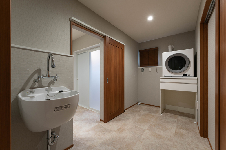 (営業・設計)ご主人が農作業をされていること、お子様の成長とともに外遊びなどで汚れものが増えることを考え、洗面台とは別に多目的の洗い場を設けることを提案させていただきました。
