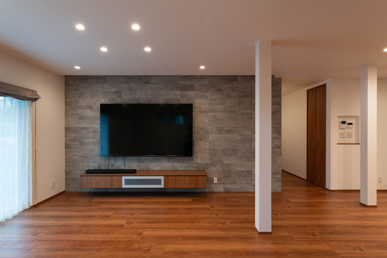 セメント模様のエコカラットをテレビ背面壁一面に。