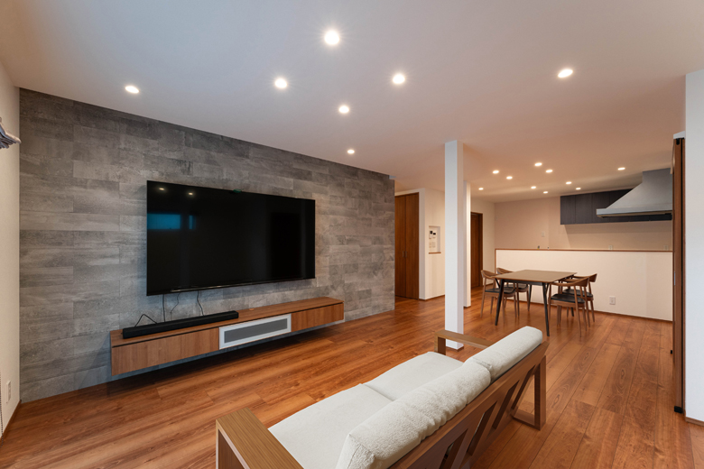 (営業・設計)ご主人から「大きなテレビを置きたい」というご要望がありましたので、それにふさわしい背面デザインをご提案しました。壁一面にエコカラットを貼り、空間のアクセントとしています。また、床の色味に合わせたフロートタイプのテレビボードを合わせ、全体に統一感のある仕上がりになりました。