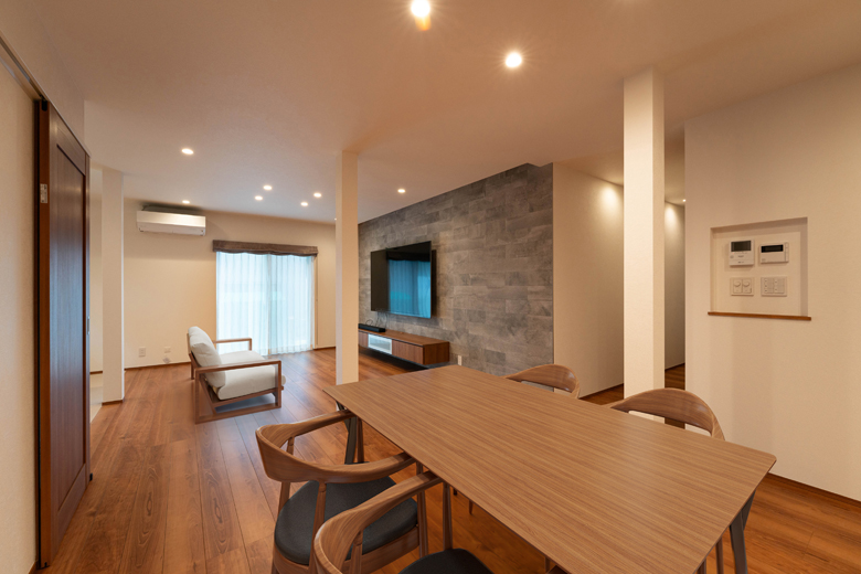 以前水まわりとお風呂場があった場所を畳スペースに変え、LDKとつなげることで、ご希望だった広いリビング空間も実現しました。既存の柱が邪魔にならないよう、間仕切りの位置にも工夫をしています。