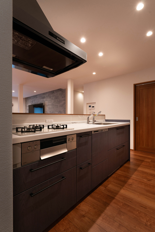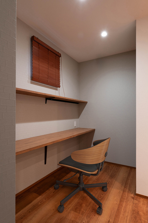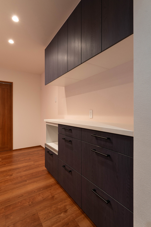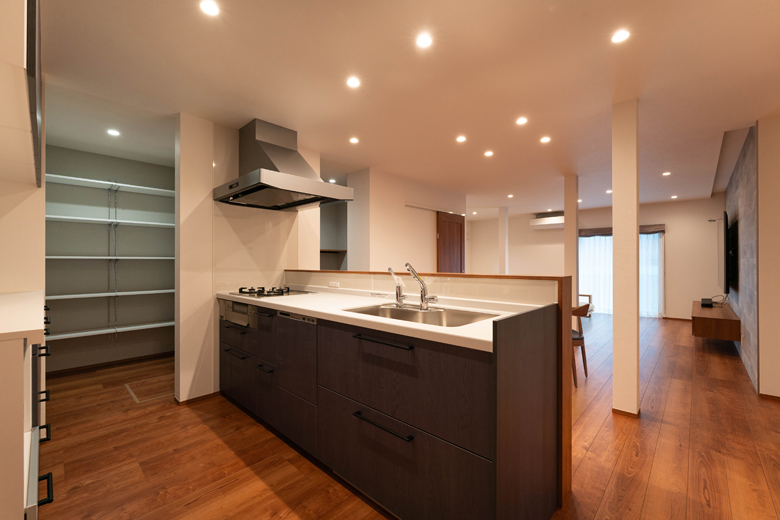 (営業・設計)奥様の家事負担を軽減するために、キッチンと水まわりをスムーズに行き来できる動線にしました。ご希望のパントリーと書斎を配置し、リビング側・キッチン側のどちらからもアクセスできる回遊動線を採用しています。お子様が勉強している様子も見に行きやすく、家事と子育ての両立がしやすい配置になりました。