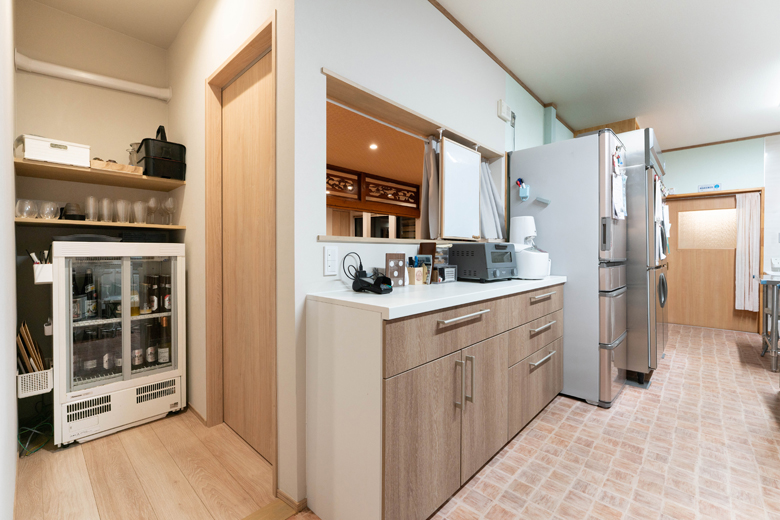 以前床の間があった場所にドリンク冷蔵庫を設置。カウンター裏側には食器棚やホワイトボードを置き、使いやすくなっている。
