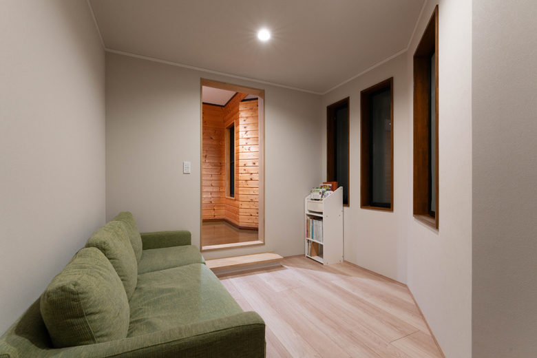 (奥様)それから2階の休憩スペース。これも五十嵐さんからいただいた提案なんです。本やドリンクも置いていますので、ゆったりとくつろげる空間になっています。ソファで寝てしまう方もいるほど、お客様から「落ち着く」と好評なんですよ。