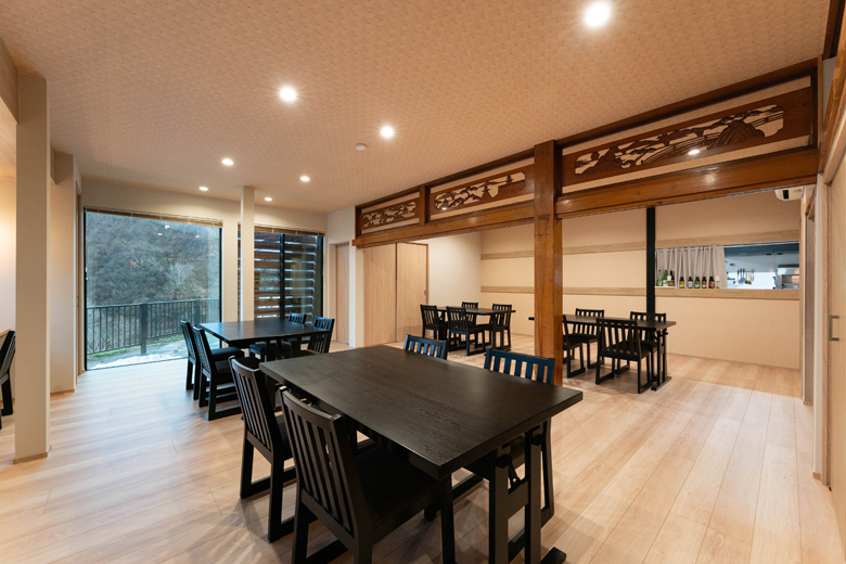 再利用したカウンター上の飾り戸。生まれ変わった広間の中で先代の想いが受け継がれていく。