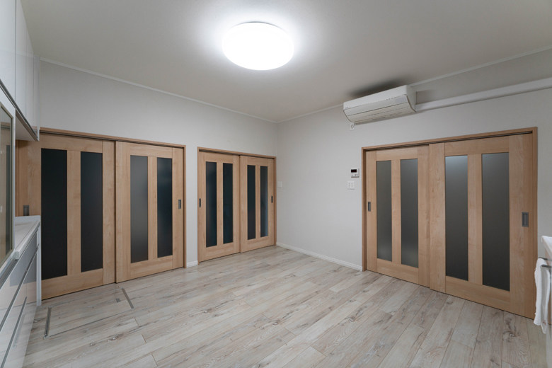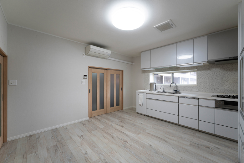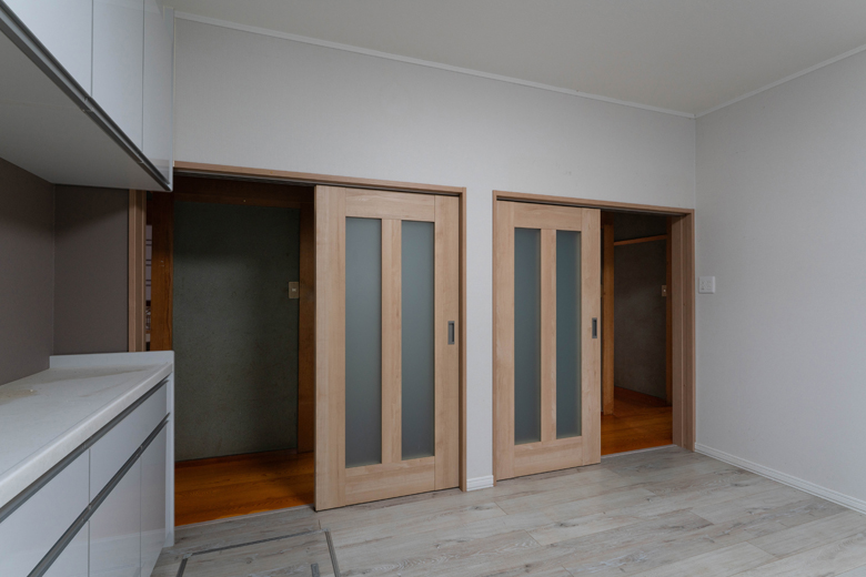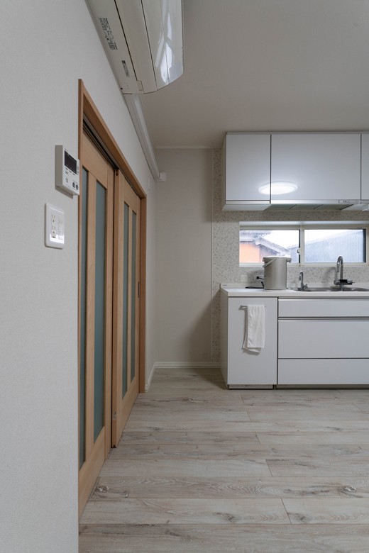 (営業・設計)以前は和室の居間とダイニングキッチンが分かれていて、少し閉鎖的な印象がありました。そこで思い切って2つの空間をつなげ、広々としたLDKにしています。対面キッチンと新しい食器棚を配置し、食卓を中心にご夫婦がゆったりとくつろげる、憩いの場になったと思います。