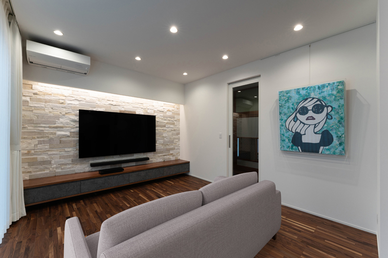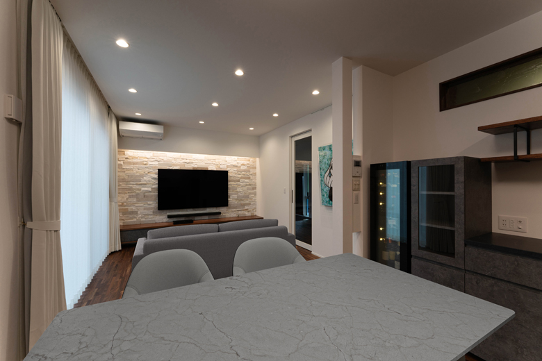 (コーディネーター)テレビとフロートテレビボードの間に、サウンドバーを埋め込みたいというご要望がありました。配線が複雑になる上、壁が天然石仕上げだったため、施工面ではかなり難しかったですね。ただ、見た目をすっきりさせつつ、音にもこだわりたいというお気持ちを形にできたと思います。