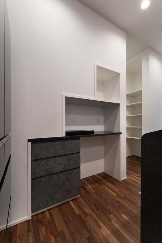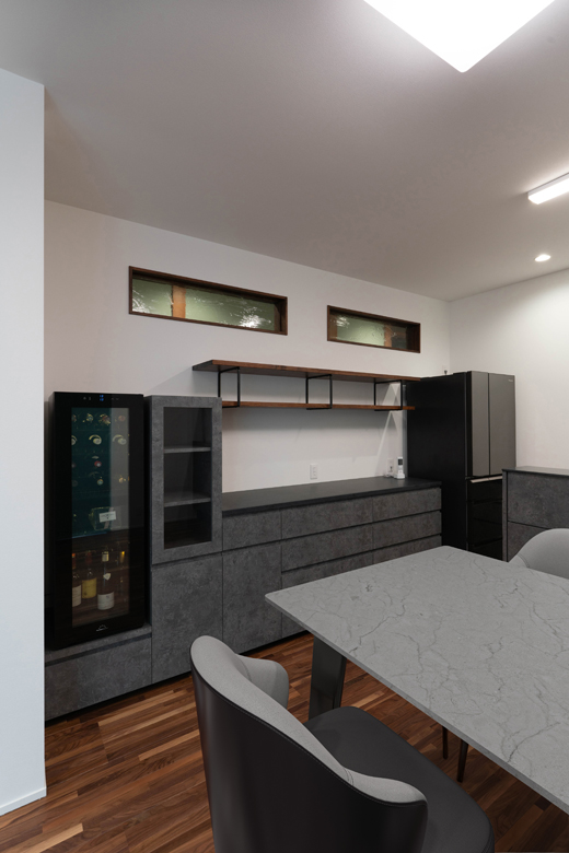 (コーディネーター)はい。ご主人からワインセラーを置きたいというご希望がありましたので、ワイン以外にもお酒をお持ちなのではと思い、ガラス戸の「見せる収納」をご提案しました。設置するワインセラーに合わせて、食器棚はフルオーダーにしています。キッチンと同じ面材で造作することで、空間全体に統一感を持たせました。