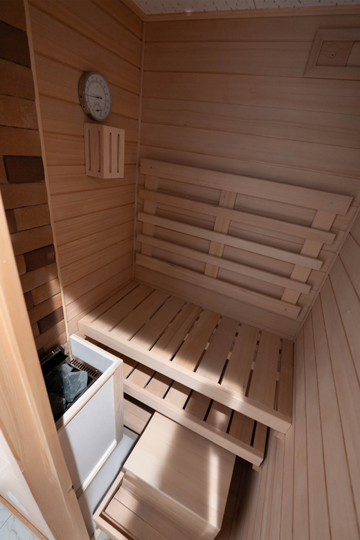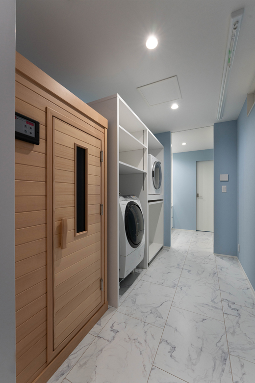 脱衣場兼ランドリーの中にサウナを設置。
